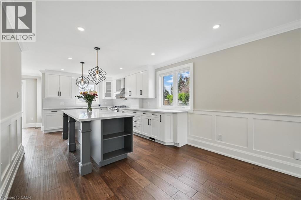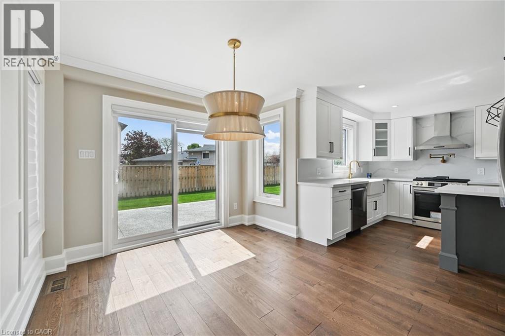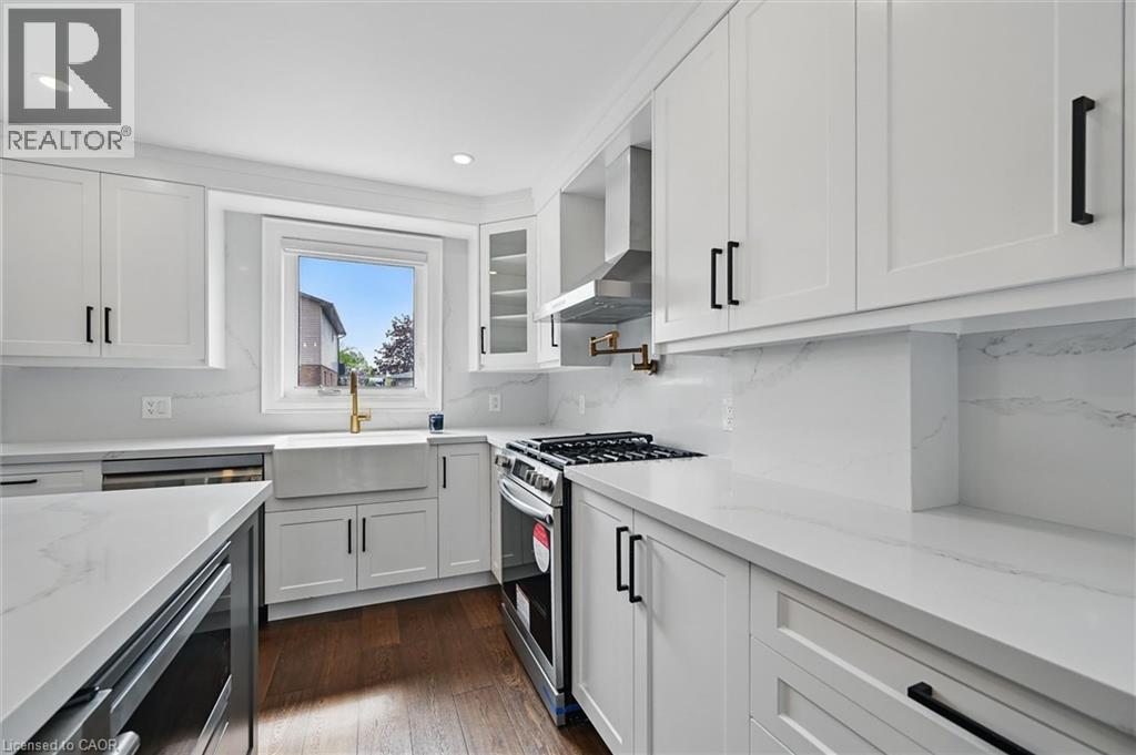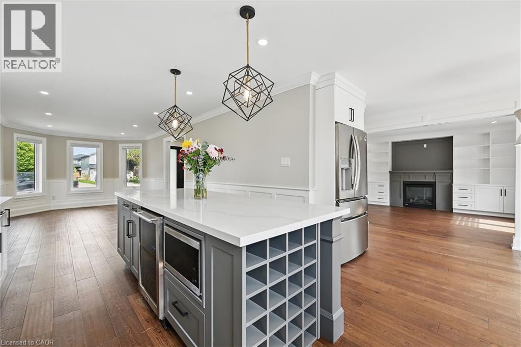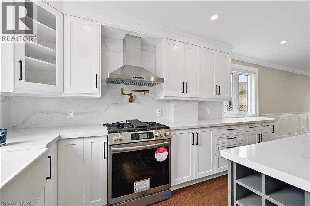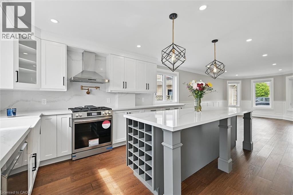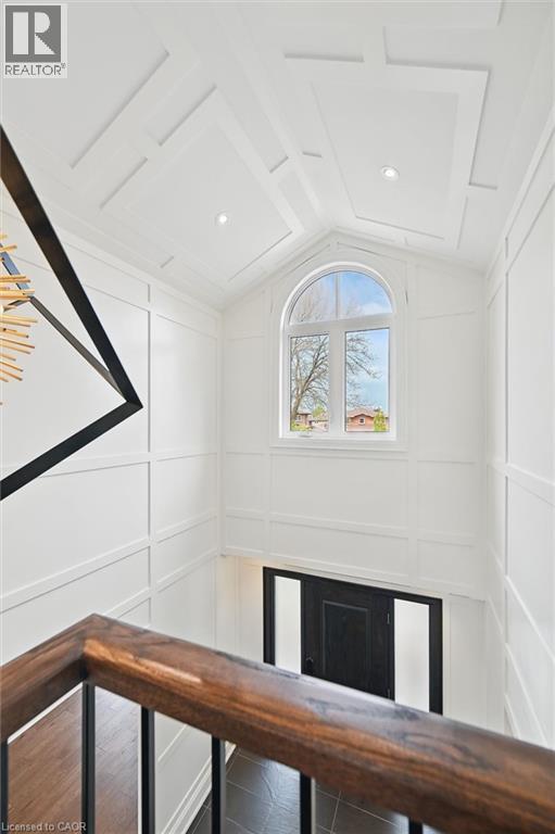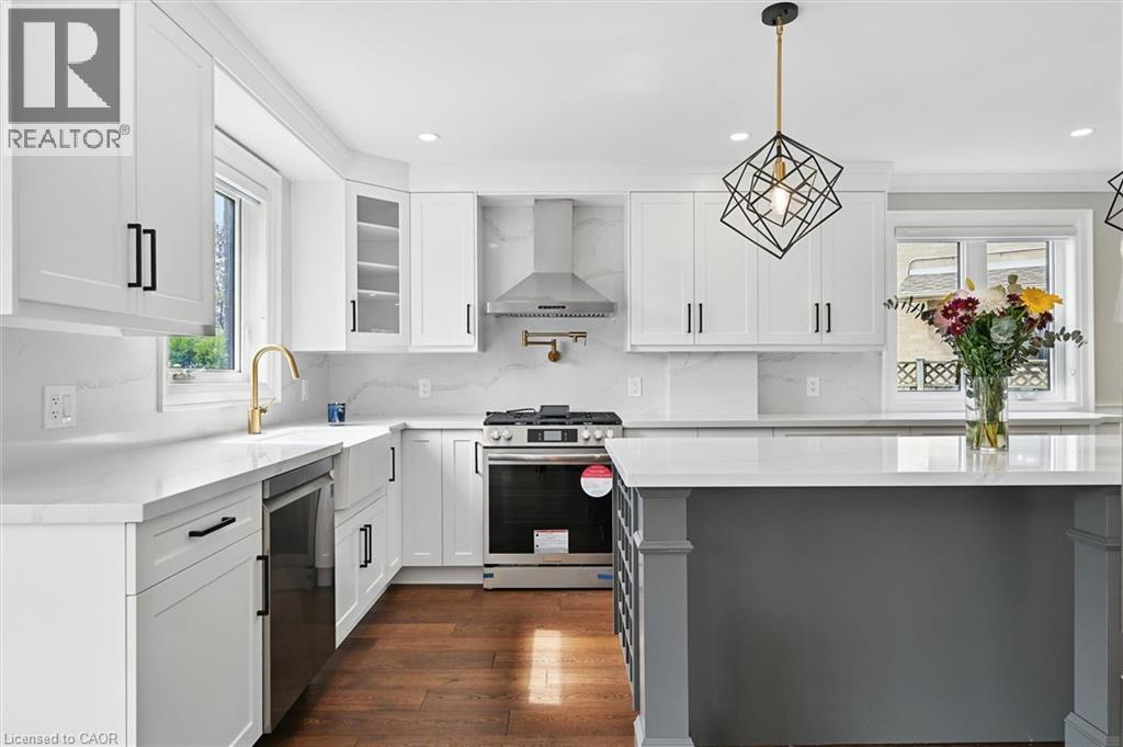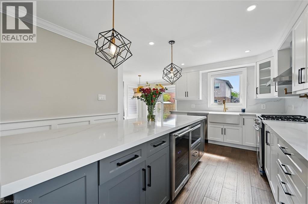 Welcome to 7 Grandview Avenue! Nestled in one of Stoney Creek’s sought-after lakefront beach communities, just steps to Lake Ontario and minutes to shopping, dining, schools, and quick QEW access. Situated on a quiet, family-friendly court, this home was meticulously renovated in 2023 with exceptional quality from top to bottom. A bright, open foyer with soaring ceilings, elegant staircase, and classic wall paneling creates a warm first impression. The main level features a formal living room and a stunning open-concept kitchen with modern soft-close cabinetry, under-cabinet lighting, quartz counters and backsplash, oversized island with built-in wine display, bar fridge and microwave, natural gas range with pot filler, and porcelain apron sink. There is a large dining room with patio doors to rear yard and an inviting family room offers a gas fireplace with custom built-ins, plus a 2 pc bath and large laundry room to complete this level. Upstairs offers three spacious bedrooms, including a primary retreat with walk-in closet and a 4-piece ensuite with double sinks, make-up station and glass shower. A 5-piece main bath features double sinks, deep soaker tub. The lower level includes a fully self-contained in-law suite with separate walk-up entrance, featuring a living room, kitchen with quartz counters and backsplash, stainless steel appliances, bedroom, 3-piece bath, laundry, and ample storage. The fully fenced pie-shaped yard boasts a huge exposed aggregate patio, concrete pad for future shed, and plenty of space to entertain or for kids to play. Extensive upgrades include trim and wainscoting, 5” engineered hardwood flooring, solid interior doors, 7” baseboards, crown molding, pot lights throughout, custom closets, and modern iron railings. Exposed aggregate driveway, walkways, and patios with stamped concrete borders. Double attached garage and double-wide driveway for up to 8 cars. 13 appliances included. Nothing to do but move in! (id:4069)